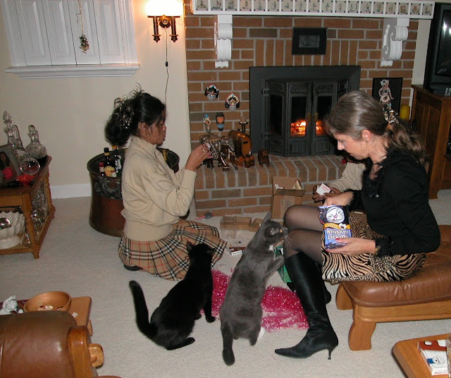 She also got to experience the entire Christmas season with us. Here she is unwrapping gifts after coming home from midnight Mass. Our two cats Barty and Spooky enjoy their treats.